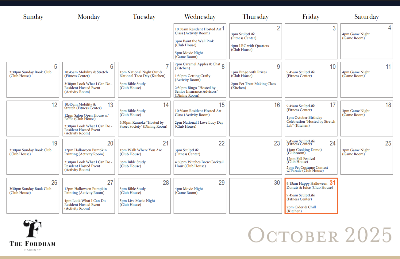 At The Fordham, we believe home is more than just a place—it’s a community. That’s why we host a variety of exciting events designed to bring neighbors together, from seasonal celebrations and fitness classes. Whether you're looking to meet new friends, enjoy live entertainment, or simply unwind with great company, there’s always something happening right outside your door.
